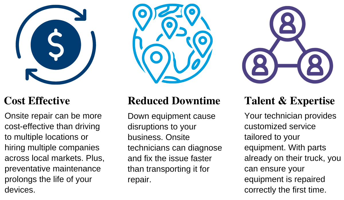 Receive regular repairs and maintenance at the location where your devices are used with onsite and preventative maintenance. Any potential issues with your equipment can be quickly identified and addressed before they become significant problems, minimizing downtime and reducing the risk of expensive repairs or replacements to improve your business’s overall efficiency and productivity.